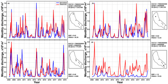 Comparison between simulated and observed streamflow at monthly time scale was performed (Figure 12). These analyses were not intended to quantify the accuracy of these simulations, but rather demonstrate the potential effect of anthropogenic factors to hydrology in general and specifically to the ITEAMS approach. It is important to note that no calibration was performed and that the AnnAGNPS model does not simulate groundwater flow into nor from streams, limiting baseflow estimation. Two metrics of NSE and PBIAS as proposed by Moriasi et al. [41,42] were used to assess agreement between the two datasets. Overall, there was a very good agreement between parts of the basin located in rural areas and not being influenced by constructed structures (Figure 12a–c). NSE values of 0.43, 0.64, and 0.49 demonstrate a good agreement between the two datasets indicating proper description of flow timing even when transferred from one simulation to another. However, PBIAS values from 4.9% to 30.3% indicate an average underestimation of monthly flow which could be attributed to differences in baseflow contribution to streamflow between simulated and observed. It is estimated that streamflow in the observed dataset (red line in Figure 12) is composed of surface flow (from local sub-watershed and from all upstream sub-watersheds) combined with potential contributions from groundwater flow, while streamflow from simulated streamflow is composed only of surface flow (compounded flow from increased time of concentration as result from multiple contributing sub-watersheds). Comparisons further downstream (Figure 12d) yield statistical values that are less desirable. Not only the amplitude but also the timing of events does not match. This can be attributed to the fact that this stream gage is located downstream of two cities (squares in Figure 12) and a large dam (diamonds in Figure 12). Managed flow represents a challenge in any hydrological modeling study, including an ITEAMS approach, in which municipalities and dams withdraw/release and affect the hydrology and deserve special attention.