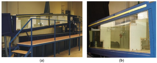 The facility where the experimental work was undertaken is located at the Laboratory of Hydraulics and Environment of Instituto Superior Técnico (IST, Lisboa, Portugal). It is a 1:2.5 scaled fishway of a prototype size indoor pool-type fishway located at the National Laboratory for Civil Engineering (LNEC, Lisboa, Portugal). It includes a 5.7 m long, 0.4 m wide, and 0.5 m deep flume, with an adjustable slope, equipped with a recirculation circuit and a pump frequency converter. An electromagnetic flow meter, installed in the recirculation circuit, measures the discharge that is controlled by the pump frequency converter. A sluice valve controls the downstream flow depth. The flume has glass side walls, enabling flow visualization and PIV measurements (Figure 1).