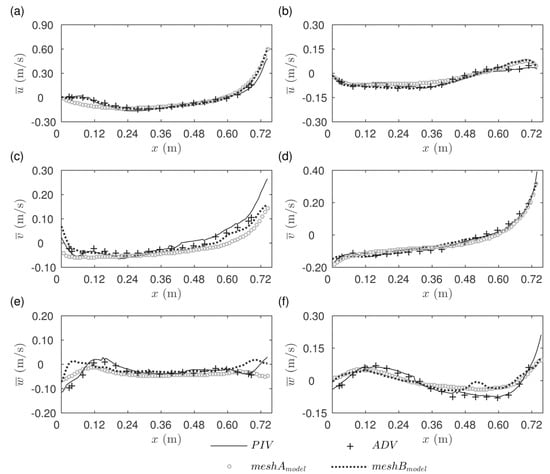 A very good agreement between the experimental and numerical results can be observed in Figure 5 for all the velocity components with the largest differences, that are still acceptable, occurring for values close to 0 of the transversal (Figure 5c) and vertical velocity components (Figure 5e,f).