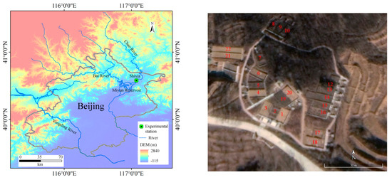The present study was done in the Shixia catchment (117°4′30″ E and 40°34′40″ N), which is located upstream of the Miyun Reservoir in Beijing, Northern China (Figure 1). This catchment covers an area of 33 km2, ranging from 130 m to 390 m a.s.l. Gneiss is the main lithology, scattered with granite and limestone. This region has a temperate territorial monsoon climate, with a mean annual rainfall amount of 475 mm, above 70% of which occurs in May–September.