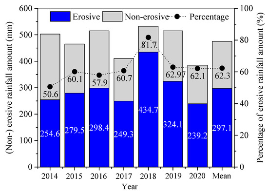 Annual erosive and non-erosive rainfall and the percentages of erosive rainfall amounts in 2014–2020.