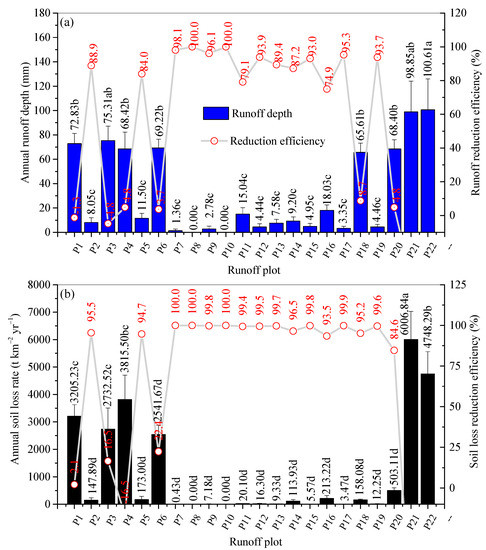 Annual runoff depth (a) and annual soil loss rate (b) and their reduction efficiencies by soil conservation measures in comparison to the mean values of bare plots 3 and 4 in 2014–2020 for the 22 runoff plots. Notes: the bars represent standard error. The average values on the columns with the same letter are not significantly different at p = 0.05, as determined by Fisher’s protected least test.