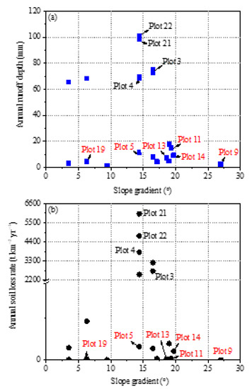 Annual runoff depth (a) and soil loss rate (b) for the 22 runoff plots in 2014–2020 with slope length.
