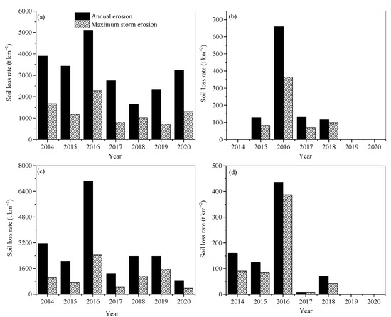 Soil loss in the maximum annual erosive event and annual soil loss on four types of land use and soil conservation measures: plot 1 (a), plot 2 (b), plot 3 (c), and plot 14 (d). The information of the plots was given in Table 1.