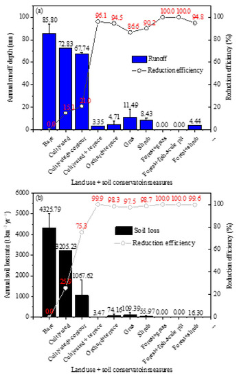 To protect drinking water safety, water quantity is a priority in the study region, and water-saving soil control measures should be considered to resolve the contradiction of soil loss control and water shortage in the downstream reservoir. The vegetation coverage of forest, shrub, and grass should be sparser, which allows more runoff to run downslope and simultaneously and effectively control soil loss. The size of the terrace on gentle slopes should be carefully designed. Bare and cultivated lands suffered the most severe soil erosion, with SLRs above 2732 t km−2 year−1, and soil conservation measures should be implemented. Cultivated land with contour tillage still suffered a very high SLR (i.e., 2541 t km−2 year−1), and terrace or other vegetation measures (e.g., grass strips) should be implemented on this kind of land, because these types of measures can greatly reduce SLRs in the study region (Figure 4b).