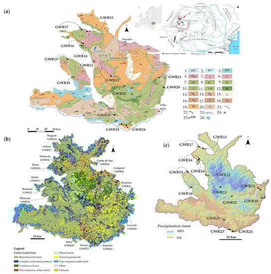 Sampling sites’ locations in the general groundwater map (a) (modified after Ghenea et al., 1981 [14]); Corinne Land Cover (b) (data from Copernicus Land Monitoring Service 2018, European Environment Agency [15]), and the mean annual precipitation (c) (modified after Fick et al., 2017 [16]) in the Apuseni Mountains. Legend for (a): 1. Gravels and sands; 2. Pyroclastic rocks; 3. Gravels, sands and clays (local or discontinuous aquifers in porous formations); 4. Limestones and marly limestones; 5. Limestones; 6. Limestones and dolomites (local aquifers in limestones); 7. Limestones, sandstones and conglomerates; 8. Calcareous sandstones and limestones; 9. Limestones, marly limestones, sandstones and conglomerates; 10. Limestones and sandstones; 11. Limestones, dolomites, sandstones and conglomerates; 12. Limestones and dolomites in metamorphic formations (local or discontinuous aquifers in fissured rocks); 13. Marls, clays, tuffs and sands; 14. Marls, clays, limestones, sands and conglomerates; 15. Igneous rocks (formations with possible deep aquifers); 16. Red clays and marls; 17. Marls and shales; 18. Shales, clays, sandstones and conglomerates; 19. Crystalline schists; 20. Igneous rocks (formations without groundwater); 21. Faults; 22. Overthrust; 23. Rivers; 24. Localities; 25. Altitude (m); 26. Lakes.
