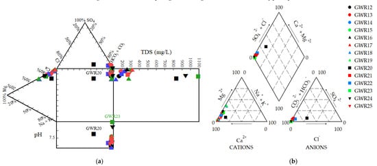 The water typology was assessed using the Piper and Durov diagrams. Both diagrams allow the visualization of the relative abundance of common ions in the water samples and assume that the sum of anions is equal to the sum of cations and thus the relative concentrations of ions are given in percentage basis. The Piper diagram offers information on the relationship between the water composition and rock types, while the Durov diagram reveals the geochemical processes that affect the groundwater [28]. The Piper diagram is a ternary plot representing the major anions (Cl−, CO32− +HCO3−, SO42−) in the lower right corner, the major cations (Ca2+, Mg2+, Na+ +K+) in the lower left corner and a diamond plot in the middle. The diamond plot results from the projection of the data from the two triangles. Based on the positioning of the sample in the diamond, the hydrochemical facies can be identified [29]. The Piper diagram was drawn using GWChart [30]. The Durov diagram is a composite plot consisting of 2 ternary diagrams, one positioned on the left side representing the major cations (Ca2+, Mg2+, Na+ +K+), the other positioned on the top, representing the major anions (Cl−, CO32−, +HCO3− SO42−), and a central rectangular binary plot containing the projection of the 2 ternary plots. In addition, a pH plot is added to the bottom and a TDS (total dissolved solids) plot is added to the right side of the diagram [31,32]. The Durov diagram was drawn using the AqQa software (free versions).