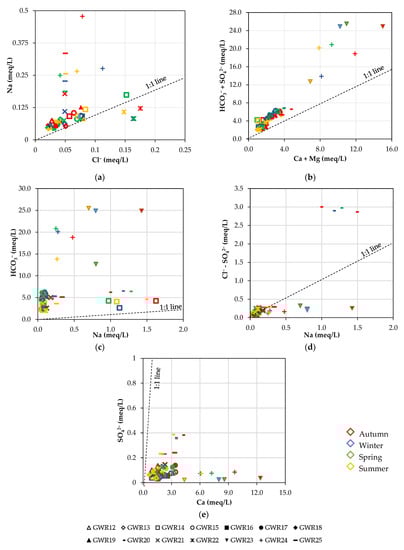 The relation between Na and Cl− may indicate (i) halite dissolution if the Na/Cl− ratio is approximately 1; (ii) silicate weathering or cation exchange if the Na/Cl− ratio > 1, and (iii) an anthropogenic input if the Na/Cl− < 1 [8,58]. Figure 3a showed that most of the studied karst waters were along the 1:1 line or above, indicating that halite dissolution and silicate weathering were the most important sources of Na. The ratio between Ca + Mg and HCO3− + SO42− around the 1:1 relation line (Figure 3b) showed that carbonates and dolomite dissolution were the main Ca and Mg sources in all samples except for GWR23 and GWR24. As shown in Figure 3c, there were no water samples plotted around the 1:1 line, suggesting that the dissolution of silicates was not the main source of cations [8,58]. As the plotted ratio of Na/ Cl−-SO42− lay around the 1:1 line (Figure 3d), these ions derive most probably from the dissolution of sodium sulphate and halite [8,58]. Since Ca concentration was much higher than SO42− (Figure 3e), the weathering of gypsum was not the main source of Ca and SO42− [8].