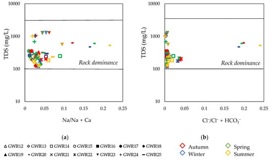With high values of TDS and low values of Na/Na + Ca or Cl−/Cl− + HCO3−, the Gibbs diagram (Figure 4) indicated that all the samples fell in the central region, suggesting that rock weathering was the main hydrochemical process influencing the chemical composition of the waters, in all the analyzed seasons.