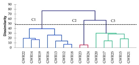 Based on the similarity in chemical characteristics, the studied karst waters were classified into three clusters (Figure 5). The first group, C1, comprises the samples located in the western–central region of the studied area. These samples correspond to karst sources with low ecological risk, having excellent quality, low EC and low carbonate content. The water samples grouped in C1 originate from local or discontinuous aquifers based on limestone/sandstone/dolomite geological beds. Cluster C2 groups the water samples with the lowest quality, GWR23 and GWR24, characterized by an average pH below 7 and high EC and carbonate contents. GWR23 and GWR24 are situated at the interface of crystalline schists, limestones and dolomites in metamorphic formations.