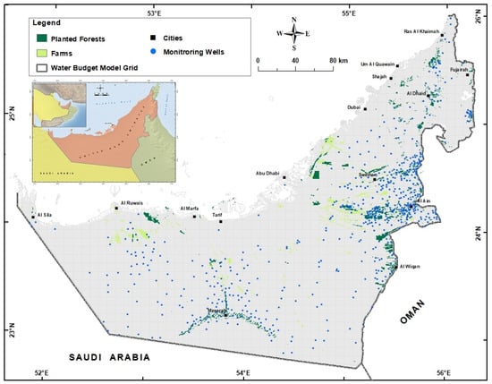 Location map of UAE. The locations of monitoring wells, farms, planted forests, and water budget model grid are also shown.