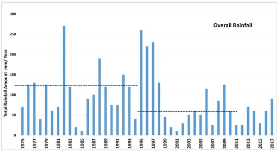 Figure 2. Total and average annual rainfall. - Groundwater: The groundwater system in UAE consists of five main aquifers: Quaternary aquifer, Sand dune aquifer, Juweiza aquifer, Carbonate aquifer, and Fractured Ophiolite. The Quaternary aquifer system is the main aquifer in UAE and the main concern in the present paper. The present annual groundwater abstraction for different purposes is 2.854 billion cubic meters (BCM), as will be discussed in detail later.