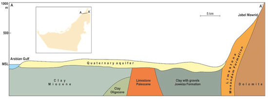 Lithology in the UAE can be divided into two major components: (a) Unconsolidated lithological units and (b) consolidated lithological units [12,13]. Figure 3, along with the next sections, presents a brief description of the characteristics of these geological units. The drilling information of the available water wells was used to construct several geological cross-sections along different directions to illustrate the physical setting of these units. An example of these cross-sections is shown in Figure 4.