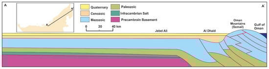 - Styles, M.T.; Ellison, R.A.; Arkley, S.L.; Crowley, Q.; Farrant, A.R. The Geology and Geophysics of the United Arab Emirates; Goodenough, K.M., McKervey, J.A., Pharaoh, T.C., Phillips, E.R., Schofield, D., Thomas, R.J., Eds.; Geology, British Geological Survey: Nottingham, UK, 2006; Volume 2. [Google Scholar]