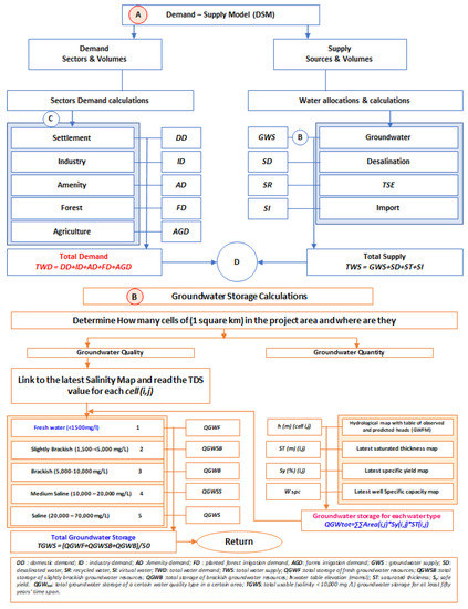 Water balance models are three-dimensional mathematical models, in general. They represent the physical environment that links all components of water resources from source to use (Figure 7). A water balance model requires a clear definition of each water-using activity and extensive empirical data to define input, process, and output quantities. For example, the hydrogeological settings of the aquifers and their properties should be well defined to be able to estimate the available groundwater supply and its sustainability [28]. Information held in the GIS and/or water resources database was employed within the groundwater budget model (GWBM) whose structure is shown in Figure 7 (Module B). The function of water availability includes 4 main components, groundwater, desalinated water, and treated wastewater.