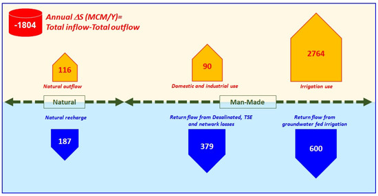 Additionally, it was also estimated that 10% of the produced desalinated seawater recharged the Quaternary (surficial) aquifer as water domestic network losses. Therefore, out of the 2043 MCM produced desalinated water, 204 MCM (10%) was added to the recharge component of the Quaternary aquifer. Therefore, the total annual recharge component from desalinated and TSE water was about 379 MCM. The addition of this value to groundwater-fed irrigation return flow (600 MCM) resulted in a value of 979 MCM for total recharge to surficial aquifer from return flow and network loess, which was more than five times the total annual recharge from rainfall and internal flux in the mountainous areas (187 MCM).
