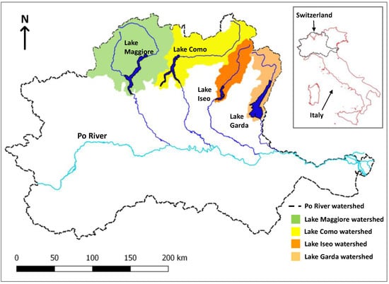 The 4 lakes are situated in the subalpine region of northern Italy and are all large (Figure 1, Garda: 368 km2, Como: 145 km2, Iseo: 61 km2, and Maggiore: 212 km2). Owing to climatic conditions and the deep maximum depth of the lakes (Garda: 350 m, Como: 410 m, Iseo: 258 m, and Maggiore: 370 m), mixing historically only occurred every 7 years, typically down to a depth of 200 m during cold and windy winters, while mixing in Iseo was prevented by a salinity gradient. The last deep mixing event was during 2005/2006 [15,16,37]. Total phosphorus trends have been analyzed for several depth aggregations from 1992–2016 [15]. Trends and recent (2016) concentrations were reported as increasing in Iseo (90 µg L−1) and Maggiore (13 µg L−1) and declining in Garda (18 µg L−1) and Como (35 µg L−1) for spring whole-column averages. However, the increases in Maggiore and Iseo were attributed to increasing hypolimnetic concentrations, whereas epilimnion (0–20 m) concentrations have been relatively stable after the 2005/2006 mixing event [15].