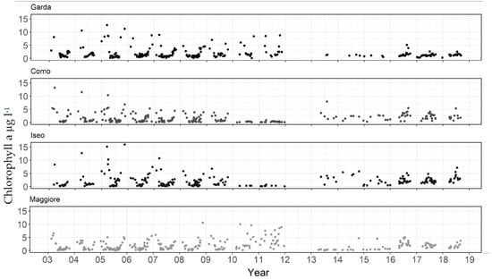 Satellite observations may have proved essential in revealing these trends in chlorophyll-a concentration over time. The benefits of using remote sensing to assess chlorophyll-a are the good spatial, temporal, and synoptic ability allowing several lakes to be assessed in a consistent approach [28]. While data gaps are a feature of the satellite record, the principal pattern of a switch from a concave shape (spring peak, clear phase, and summer/autumn peak) to a convex shape (dominant summer concentrations) was visible from the satellite record alone. This is important to demonstrate as the approach could be used to examine alterations in plankton dynamics from climate change in unmonitored lakes globally. However, it would be important to account for differing optical lake types to ensure a better relationship between reflectance and chlorophyll-a [68]. Opportunities to extend such approaches have recently been advanced with the European Space Agency’s commitment to providing data on climate variables for lakes, including chlorophyll-a [69]. An important drawback of using remote sensing is the satellite’s inability to provide a depth profile of chlorophyll-a, with satellite estimates being dependent on light penetration equating to 90% of Secchi depth [70]. Chlorophyll-a is well known to vary significantly with depth—often having a maxima below 10 m with particular species adapted to live even deeper [71,72]. This may be important given the switch to more motile species such as dinoflagellates and cryptophytes as in Lake Garda [16]. It is possible that the lower surface chlorophyll-a in Lake Garda recorded by satellite could be an artifact and reflect a shift to motile species occurring at a deeper depth.