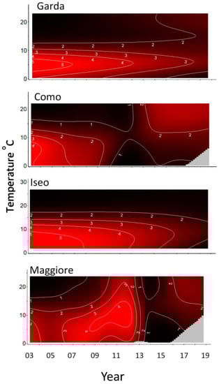 Contour plots were produced to visualize model results for chlorophyll-a with temperature over time (Figure 3). The contour lines and color intensity represent chlorophyll-a in 1 µg L−1 increments. Common to all the lakes were the higher concentrations in the bottom left of the figures occurring at lower temperatures (<10 °C) typically found over the winter-spring during the period 2003–2010. Directly above this, in the upper left, were lower concentrations typically found at higher summer temperatures during this period. This pattern then appeared to change. For Lakes Como and Maggiore, from about 2010 or 2013, the pattern was inverted, with higher concentrations now being found at higher temperatures (summer) and lower concentrations at lower temperatures in the winter-spring. Garda and Iseo appeared to transition to lower concentrations with more uniform concentrations at all temperatures.