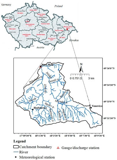 The torrential Jičinka River basin up to the “Novy Jičin” water level monitoring station (w.l.m.s) (Figure 1) is situated in the Moravian-Silesian Region, in the eastern part of the Czech Republic. It is also presented in Đukić et al. []. Altitudes in the Jičinka River basin vary from 270 m above sea level in the lower part of the basin to 1000 m in the source areas of the basin.