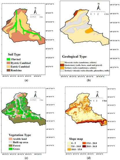 The map of soil types (a), the map of geological types (b), the map of vegetation types (c) and the slope map (d) of the Jičinka River basin up to the “Novy Jičin” w.l.m.s.