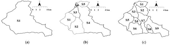 The analyzed configurations of the Hydrologic Modeling System (HEC-HMS) model: the lumped model (a) and the semi-distributed models with discretization into six sub-catchments (b) and nine sub-catchments (c).