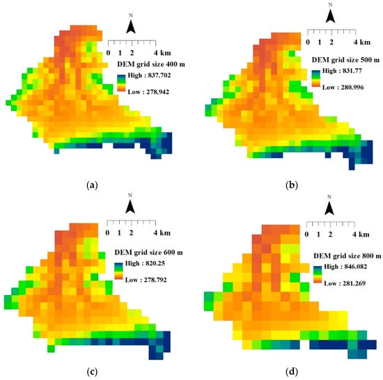 Spatial discretizations of the digital elevation model (DEM) of the Jičinka River catchment in the the Système Hydrologique Européen TRANsport (SHETRAN) model—grid sizes 400 (a), 500 (b), 600 (c) and 800 m (d).