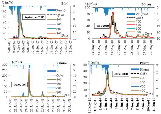 Observed (Qobs) and the SHETRAN model simulated streamflow hydrographs for the grid cell sizes 400, 500, 600 and 800 m at the Jičinka River monitoring station (“Novy Jičin” w.l.m.s) for the calibration (September 2007) and validation (June 2009, May 2010 and June 2010) rain events.