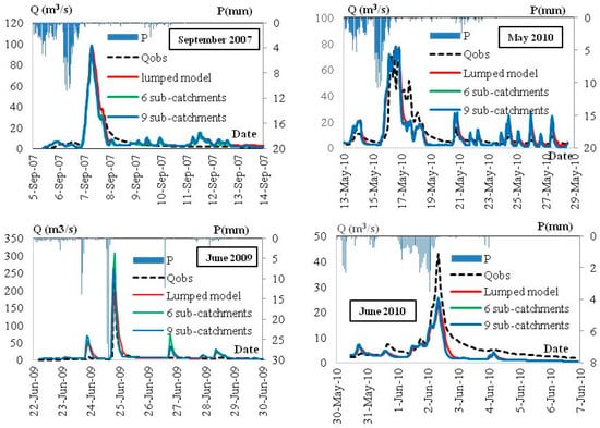 Observed (Qobs) and the HEC HMS model-simulated streamflow hydrographs for different configurations of catchment discretization (lumped model, six sub-catchments and nine sub-catchments) at the Jičinka River monitoring station (“Novy Jičin” w.l.m.s) for the calibration (September 2007) and validation (June 2009, May 2010 and June 2010) rain events.