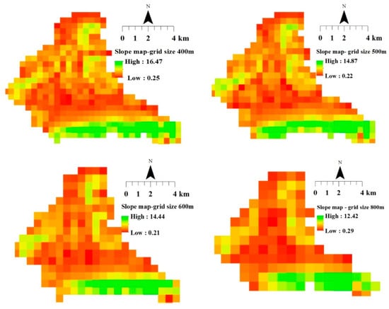 Slope maps obtained on the basis of DEMs of different grid cell sizes.