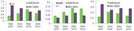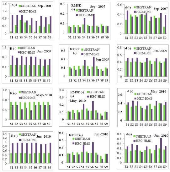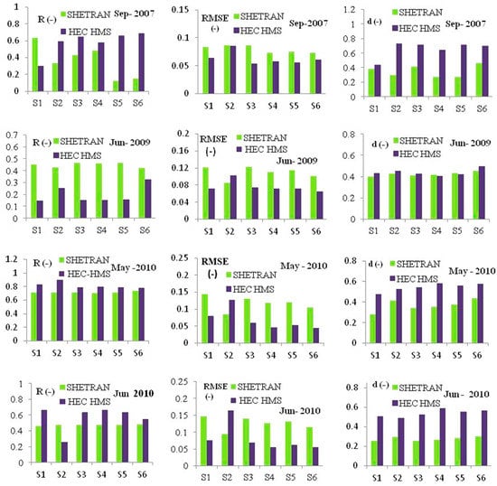 When analyzing the values of evaluation criteria for the lumped model configurations (Figure 8) and along the discretized sub-catchments (Figure 9 and Figure 10) it can also be concluded that better performance measures were obtained mostly by application of the HEC HMS model than by the application of the SHETRAN model. While in the case of the catchment discretization into six sub-catchments, the performance measures are consistent along the sub-catchments, in the case of the catchment discretization into nine sub-catchments, some inconsistencies were noticed along the sub-catchments denoted by S6 and S4. For these sub-catchments, the obtained values of the RMSE and d are better for the SHETRAN model than for the HEC HMS model. It should also be noted that the obtained performance measures for all analyzed model configurations are mostly better for the calibration period than for the validation periods.