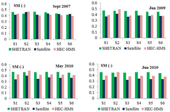 Comparative overview of the average soil moisture values within the sub-catchments of the Jičinka River catchment obtained by satellite soil moisture downscaling and by applying the SHETRAN and HEC HMS models (configuration with discretization in six sub-catchments) for the analyzed rain events in September 2007, June 2009, May 2010 and June 2010.