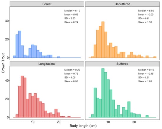 Histogram plots showing the distribution of brown trout (Salmo trutta) body lengths (cm) among the four site types: Pristine or least-impacted ‘Reference’ sites (=Forest) that were typically located further upstream due to urbanization in lower reaches, site pairs with an ‘Unbuffered’ upstream site and a downstream ‘Buffered’ site with a woody riparian buffer on both banks, and ‘Longitudinal’ sites that were typically located further downstream from the other site types to capture cumulative impacts of urban land uses. Mean and SD, median, and skewness of each site type are given in each panel.