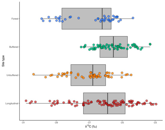 To test our hypothesis (3) that the “brown” food web channel (i.e., driven by allochthonous carbon sources) would be more dominant in buffered sites, we analyzed δ13C from a total of 244 biological samples (i.e., fin clips) that were collected from stream fishes during the field surveys (Salmo trutta: n = 219, Salvelinus fontinalis: n = 24, Phoxinus phoxinus: n = 1). Overall, fish from buffered sites generally encompassed a narrower δ13C range (from −27.5 ‰ to −23.3 ‰) than fish from unbuffered sites (from −30.4 ‰ to −24.5 ‰) and shifted towards more enriched δ13C—i.e., the detrital-driven “brown” food web channel (median buffered: −25.5 ‰ vs. median unbuffered: −26.8 ‰; Figure 5 and Figure 6). Interestingly, δ13C from our forested reference sites showed a bimodal distribution with a smaller peak at −29.0 ‰ and the larger peak at −25.5 ‰. The isotopic composition of fish from longitudinal sites showed the largest variability and ranged from −30.8 ‰ to −22.9 ‰.