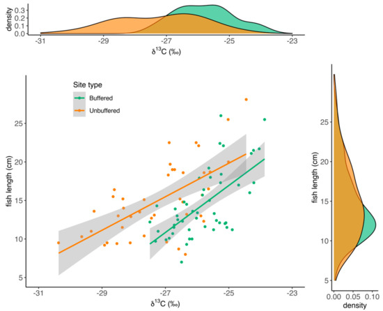 Relationship between isotope signatures (δ13C) and fish body size (cm) whilst accounting for site type (unbuffered and buffered, N = 93 biological samples). Separate regression lines for buffered (green) and unbuffered (orange) sites. The density plots along margins show differences in the distribution of values (top, δ13C; right, fish length) between the buffered and unbuffered sites.