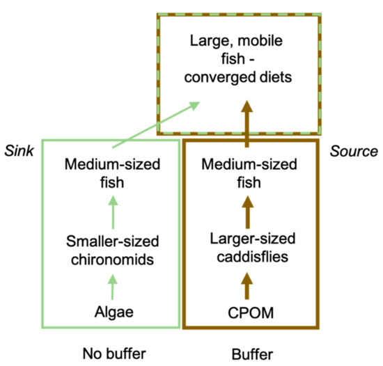 Our findings add to the oft-quoted principle that “you are what you eat” by suggesting “you are where you eat”. We posit that the absence of a forest buffer resulted in a dietary shift towards the putative algal-driven “green” food web channel, as indicated by more 13C depleted stable isotopes in fish. We speculate that trout were more dependent on smaller grazing invertebrates, including chironomids in unbuffered stream reaches (Figure 7). However, more C13 enriched stable isotopes in fish from buffered sites pointed to the potential for greater reliance on terrestrial-sourced carbon (i.e., the “brown” food web channel). We speculate that the generally larger sized detritivores (shredders such as limnephilid caddisflies utilizing allochthonous CPOM) makes them a more favorable food for trout [67]. Trout are known to be size-specific predators and the higher overall energetic benefits of preying on large food items, within (in the upper end) the prey handling size range of an individual, have been shown in a number of studies [68].