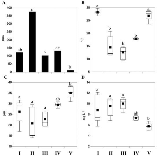 Seasonal dynamics of rainfall accumulation (Rain) (A), and boxplots depicting seasonality of water temperature (Temp) (B), salinity (Sal) (C), and dissolved oxygen (DO) (D) in Santa Giusta Lagoon along the study periods. Five periods were considered: Summer 2018 (I), Autumn (II), Winter (III), Spring (IV) and Summer 2019 (V). Boxplots include the entire series of data for each season. Lines represent medians; squares represent means. Bottom of box is the first quartile (Q1); upper part is the third quartile (Q3). Whiskers represent the 90th and 10th percentiles. Different letters indicate significant differences among periods (p < 0.05).