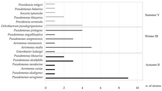 On the other hand, Figure 4 shows the distribution of all the different microbial species identified during the various seasons. The intestinal microflora, detected in Autumn 2018, was represented by the ubiquitous Pseudomonas spp. (94%) and Aeromonas caviae (6%), while in Winter 2019 the presence of Pseudomonas spp. (53%) so as Aeromonas spp. (40%) was consistent while Enterobacter ludwigii was less numerous (7%). The greatest number of different genera was detected in the intestinal tract of the mullets in Summer 2019, with the species Ochrobactrum pseudogrignonense (40%), Pseudomonas spp. (30%), Providencia spp. (20%) and Kocuria tytonicola (10%) (Figure 4).