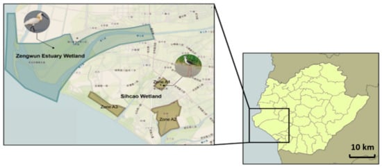 Wetlands of international importance (Zengwun Estuary Wetland and Sihcao Wetland (Zones A1–3)) in Tainan city with their important habitats for Black-faced Spoonbills in Zengwun and Black-winged Stilts in Sihcao wetland (retrieved from [35]).