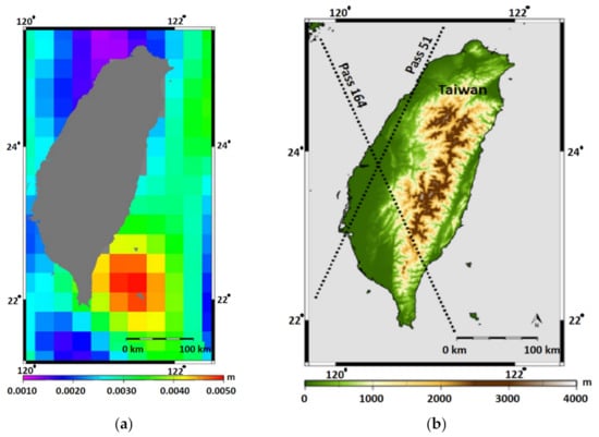 Vertical land motions (VLMs) are a key component of understanding how sea levels have changed and how coastal areas may be affected by future sea levels [39]. In studies of sea level rise over the past multidecadal to century time scales, VLM has become a prominent concern [40,41]. In this study, vertical land motions data were derived from 50 GPS continuous station [13] and 510 precise leveling data [42] covering the period of 2000–2008 to characterize the present-day vertical displacement field of Taiwan.
