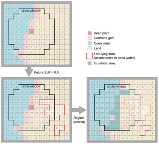 Figure 5 shows the procedure of the modified region growing algorithm proposed in this study. The future SLR is subtracted from the DEM cell within the circle window extent of the seed point to generate the possible flooding map. After performing the region growing algorithm, we can get the inundated area in dark blue. The new inundated area is selected as seed points, and we use the region growing algorithm to search the inundated area until no change occurs. The DEM cells with values under elevation 0 in the red polygon are not considered as the inundation area, because these pixels are not connected to previously inundated cells.