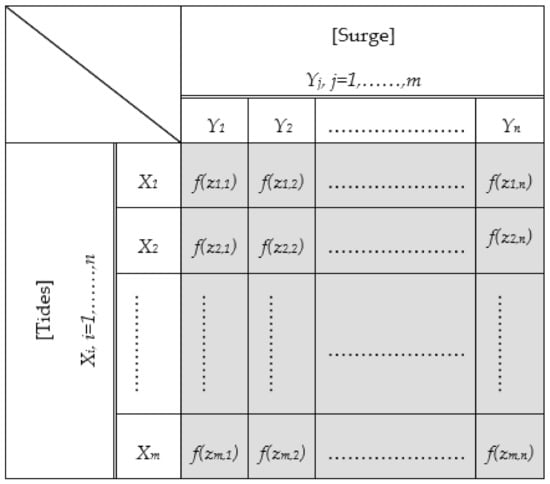 Then, the time series of tides X(t) and storm surges Y(t) are used to construct histograms for the tides and storm surges. With reference to Figure 6, for N data points, n intervals for tides (X), and m intervals for storm surges (Y), the relative frequencies, f, in the highlighted cells represent the probabilities of occurrence of tides and storm surges for the given intervals.