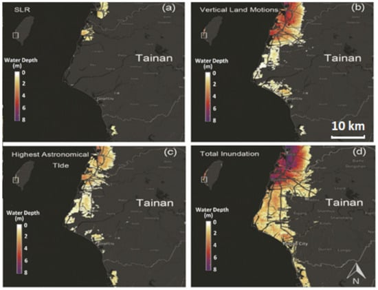 Inundation map (m) for Tainan under different inundation situations: SLR (a), Vertical Land Motion (b), Highest Astronomical (c), and Total Inudation (d).