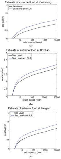 By performing the tidal analysis, we can obtain the separated tide with considering the long-term SLR and surge components. Then, the DJPM is applied to the tide and surge level data to obtain the joint probability distribution. Therefore, the extreme flood estimation is derived from the integration of joint probability function and the conversion of time unit of probabilities. Figure 9 and Table 4 represent the estimation of extreme sea level of tide-gauge stations selected in this study. The extreme sea level at the north part of Tainan is relatively larger than those at the others.