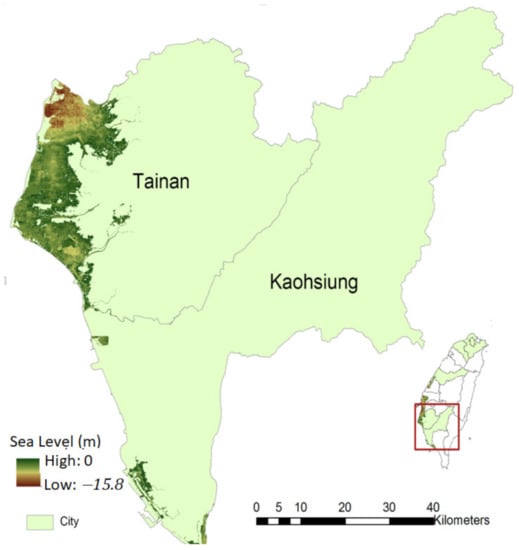 Therefore, the western floodplain in Taiwan is very vulnerable to SLR and extreme flood events from the perspective of population exposure [33]. In addition, anthropogenic land subsidence caused by excessive groundwater utilization at the western coastal plain cannot be neglected. According to the Government Report on Water Resources, more and more farmers in the southwestern coastal areas of Yunlin, Chiayi, and Tainan have expanded their business into aquaculture because of the profits and economical matter. Aquaculturists have dug many unregistered wells and pumped excessive amounts of groundwater, taking advantage of a cheap source of water with stable temperature. Moreover, land subsidence increases the vulnerability of inundation of the low-lying area, saltwater intrusion, and soil salinization, which results in the groundwater contamination and the loss of coastal wetlands [13].