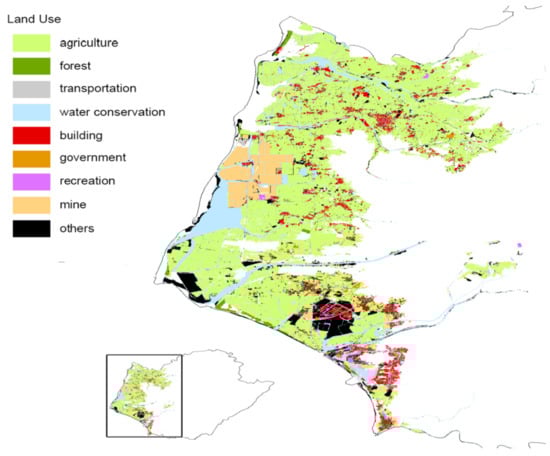 To present the land use categories that will be influenced by the total inundation situation, we applied the land use data provided by the National Land Surveying and Mapping Center (NLSC), Ministry of the Interior, Taiwan on the inundation area of the extreme flood in Tainan. The data are investigated and produced from 2006 to 2015. Lands are classified into nine land use categories, including agriculture, forest, transportation, water conservation, building, government, recreation, mine, and others.