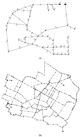 Water distribution networks (WDNs) of (a) Santa Maria di Licodia and (b) Modena. Arrows indicate flow direction after the preliminary analysis.