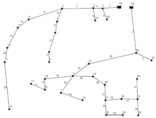 The WDN partitioning algorithm was then applied considering as benchmark the flow directions obtained in the modelling of the WDN (see Figure 1a). Since the WDN features nl = 9 loops, i.e., 8 geometric loops + 1 source interconnection path, the minimization of the transport function led to the removal of 9 pipes, namely, pipes 9, 13, 16, 18, 22, 26, 32, 34, and 39, for opening the loops. As expected, the resulting WDN configuration was a system of two branched networks, each of which was fed by a single source (Figure 5). In fact, the minimization of the transport function enabled clustering the nodes of the WDN into two partitions. To restore a suitable level of reliability in terms of number of closed loops, which help water supply in scenarios of mechanical failure in the WDN, while keeping two separate partitions, all the removed pipes except for pipes 18 and 26 were re-introduced. In fact, pipes 9, 13, 16, 22, 32, 34, and 39 do not contribute to WDN partitioning, while pipes 18 and 26 do. These two pipes were then considered the boundary pipes between the left and right partitions of the WDN (see Figure 6).
