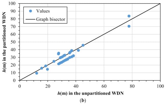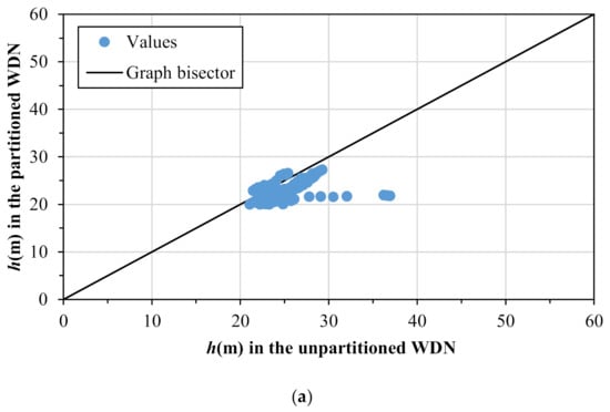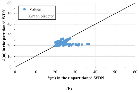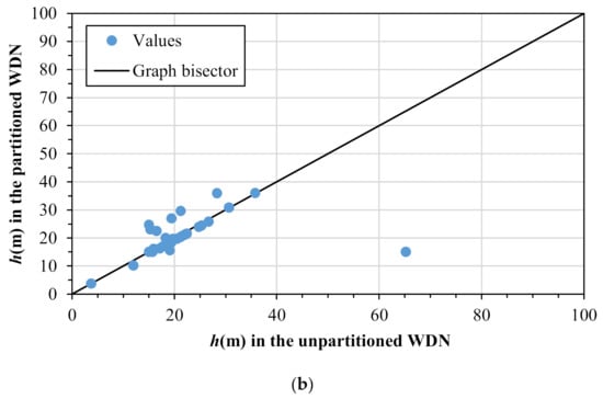 WDN of Modena. In the presence of four control valves, comparison of daily maximum (a) and minimum (b) pressure heads h (m) between the unpartitioned and partitioned WDN.