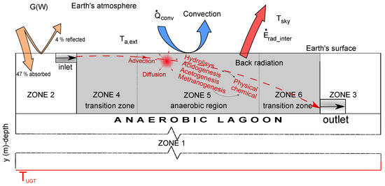 Considering a system where the lagoon and its environment are included, different zones can be identified (Figure 1). Depending on the local parameters—thermal conductivity, specific heat, density, and where biological processes take place—they are considered different zones. Boundary conditions are located on the borders. Undisturbed ground temperature is a ground thermal property situated at a depth where the ground temperature is approximately invariable, depth value depends on climatic conditions and is different in various regions of the Earth [23,24].